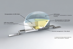 Large area displays composed of LED panels are being used for advertisement and announcements, for example in sport arenas. There can be up to millions of RGB-LEDs in one display. Each RGB-LED contains a blue, a green and a red emitting semiconductor chip. By steering the currents dedicated to each of these 3 chips, a large variety of colors can be achieved my mixing the emission spectra. Thermally stable silicones are used as encapsulants for the chips in the package.