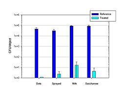 Inactivación de esporas de conidio de Aspergillus niger DSM 1957 bajo distintos escenarios de contaminación (de forma puntual, atomizado, leche, sacarosa) y nitrógeno como gas de procesado (ancho de vía: 1 mm, distancia entre toberas: 10 mm, velocidad: 10 m/min, PCT: 100%, caudal de gas: 2000 l/h).