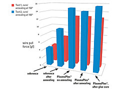 En colaboración con sus socios, Plasmatreat ha desarrollado un nanorrecubrimiento ultrafino especial para resolver este problema. El recubrimiento antisangrado PlasmaPlus® evita que se humedezcan las superficies de contacto y refuerza la conexión de los hilos, una ventaja añadida que puede demostrarse claramente mediante pruebas de tracción de hilos. Además, este recubrimiento no afecta a la unión entre el adhesivo y el leadframe; se aplica antes pegar el chip y mantiene su estabilidad cuando se almacena en condiciones secas.