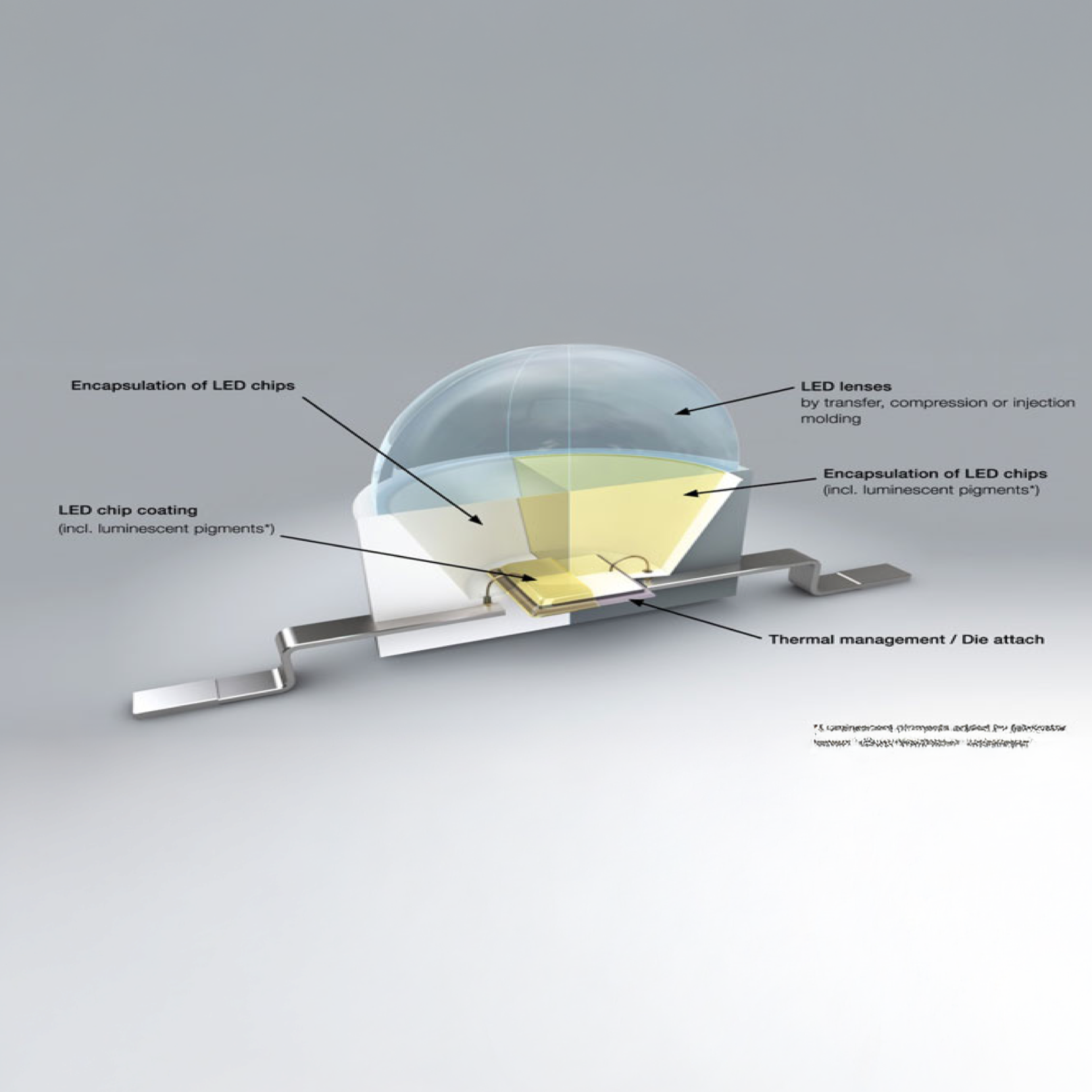 LED or semiconductor chip assembly processes typically use an electrically conductive, epoxy-based adhesive as a bonding agent. During thermal curing, low-viscosity components in the adhesive may flow out of the bond area and wet the surrounding surfaces, especially the electrical contacts for the wire bond pads. This phenomenon is known as 'bleeding'.