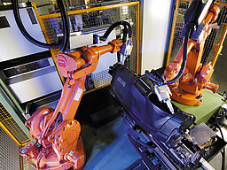 産業用ロボットに RD 1004型回転ノズル を搭載してプラスチックコアの表面をスキャンすれば、部品全体の処理が約40秒で完了します。